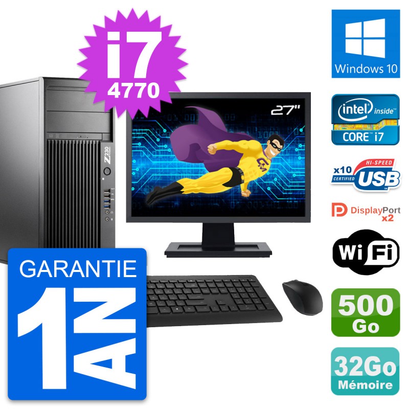 PC Tour HP WorkStation Z230 - Intel Core i7-4770 3.4 Ghz (8 Mo) - 32 Go DDR3 - Disque Dur 3,5" 500 Go - Graveur DVD - Clef Wifi USB - Windows 10 - Livré avec Ecran 27" + clavier + souris (Marques et modèles variables) - Garantie 1 an.