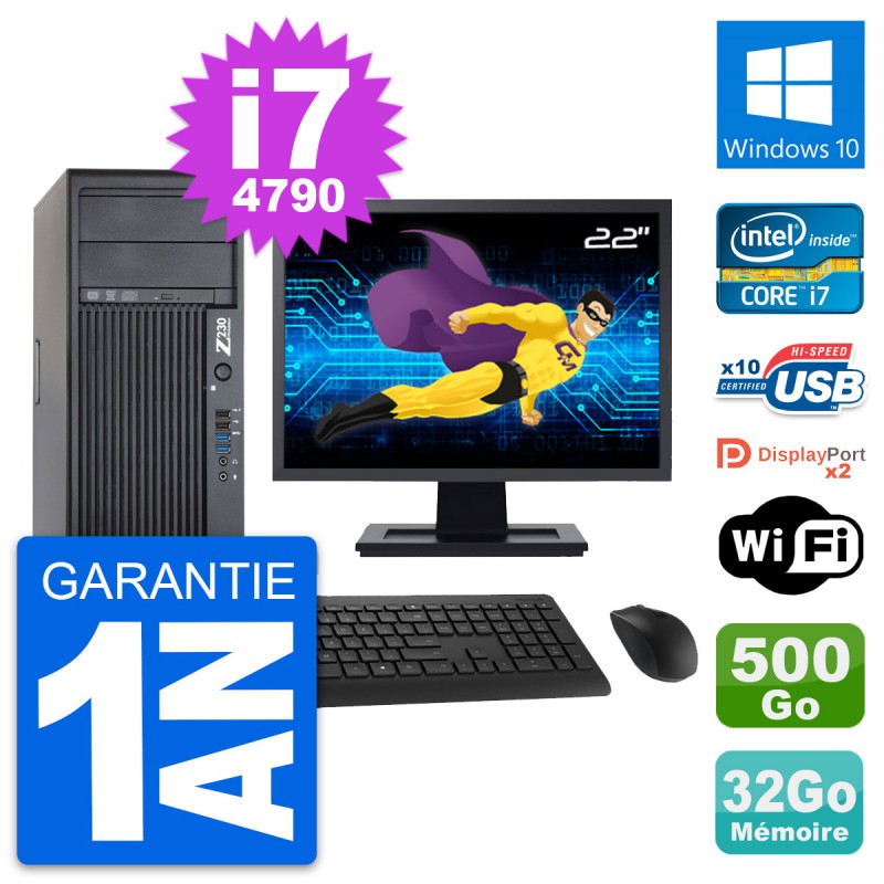 PC Tour HP WorkStation Z230 - Intel Core i7-4790 3.6 Ghz (8 Mo) - 32 Go DDR3 - Disque Dur 3,5" 500 Go - Graveur DVD - Clef Wifi USB - Windows 10 - Livré avec Ecran 22" + clavier + souris (Marques et modèles variables) - Garantie 1 an.