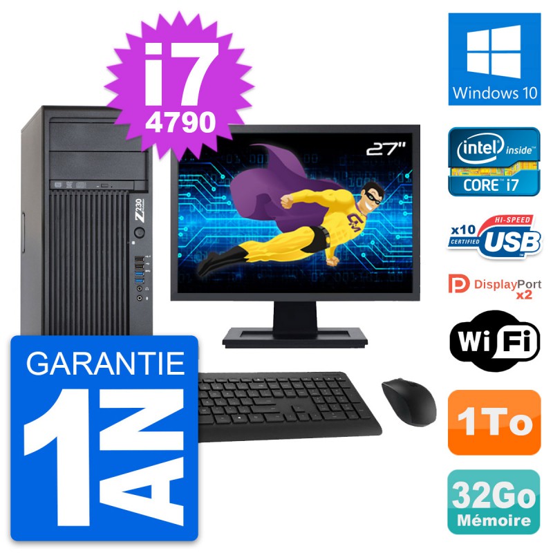 PC Tour HP WorkStation Z230 - Intel Core i7-4790 3.6 Ghz (8 Mo) - 32 Go DDR3 - Disque Dur 3,5" 1 To - Graveur DVD - Clef Wifi USB - Windows 10 - Livré avec Ecran 27" + clavier + souris (Marques et modèles variables) - Garantie 1 an.