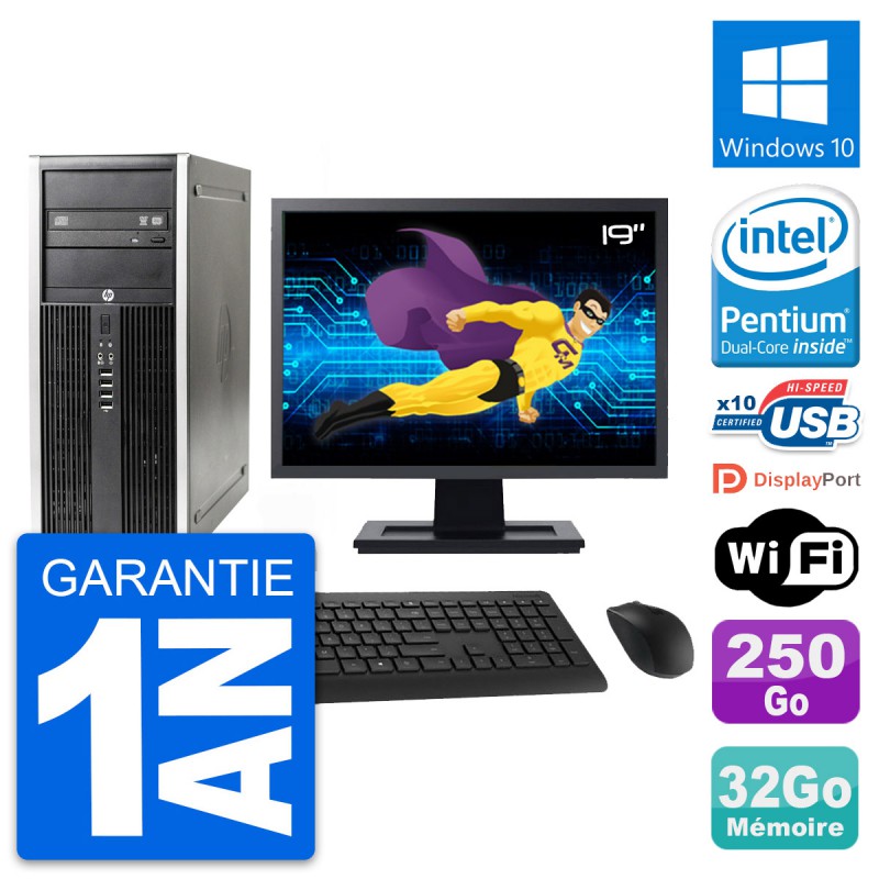 PC Tour HP 8300 Elite - Intel Pentium Dual-Core G630 2.7 Ghz (3 Mo) - 32 Go DDR3 - Disque Dur 3,5" 250 Go - Graveur DVD - Clef Wifi USB - Windows 10 - Livré avec Ecran 19" + clavier + souris (Marques et modèles variables) - Garantie 1 an.