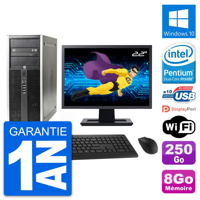 PC Tour HP 8300 Elite - Intel Pentium Dual-Core G630 2.7 Ghz (3 Mo) - 8 Go DDR3 - Disque Dur 3,5" 250 Go - Graveur DVD - Clef Wifi USB - Windows 10 - Livré avec Ecran 22" + clavier + souris (Marques et modèles variables) - Garantie 1 an.