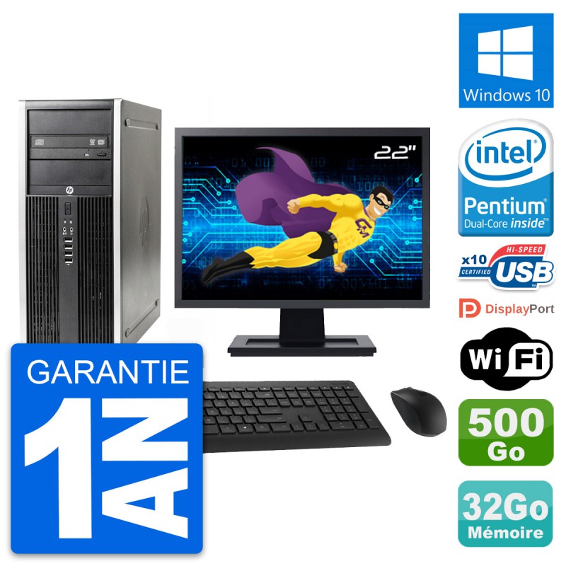 PC Tour HP 8300 Elite - Intel Pentium Dual-Core G630 2.7 Ghz (3 Mo) - 32 Go DDR3 - Disque Dur 3,5" 500 Go - Graveur DVD - Clef Wifi USB - Windows 10 - Livré avec Ecran 22" + clavier + souris (Marques et modèles variables) - Garantie 1 an.