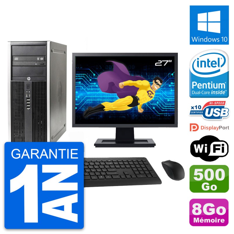 PC Tour HP 8300 Elite - Intel Pentium Dual-Core G630 2.7 Ghz (3 Mo) - 8 Go DDR3 - Disque Dur 3,5" 500 Go - Graveur DVD - Clef Wifi USB - Windows 10 - Livré avec Ecran 27" + clavier + souris (Marques et modèles variables) - Garantie 1 an.