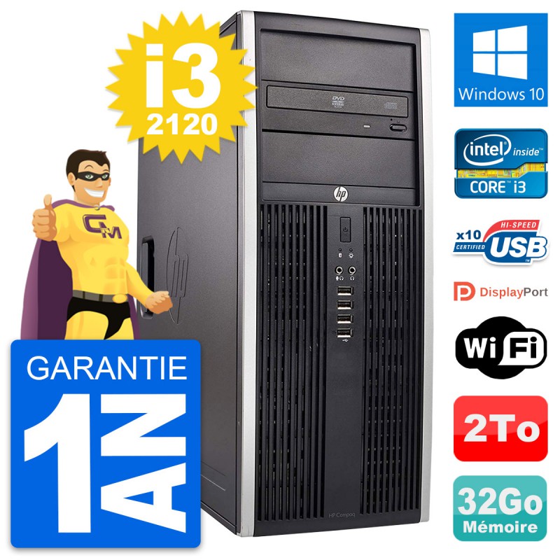 PC Tour HP 8300 Elite - Intel Core i3-2120 3.3 Ghz (3 Mo) - 32 Go DDR3 - Disque Dur 3,5" 2 To - Graveur DVD - Clef Wifi USB - Windows 10 - Garantie 1 an.