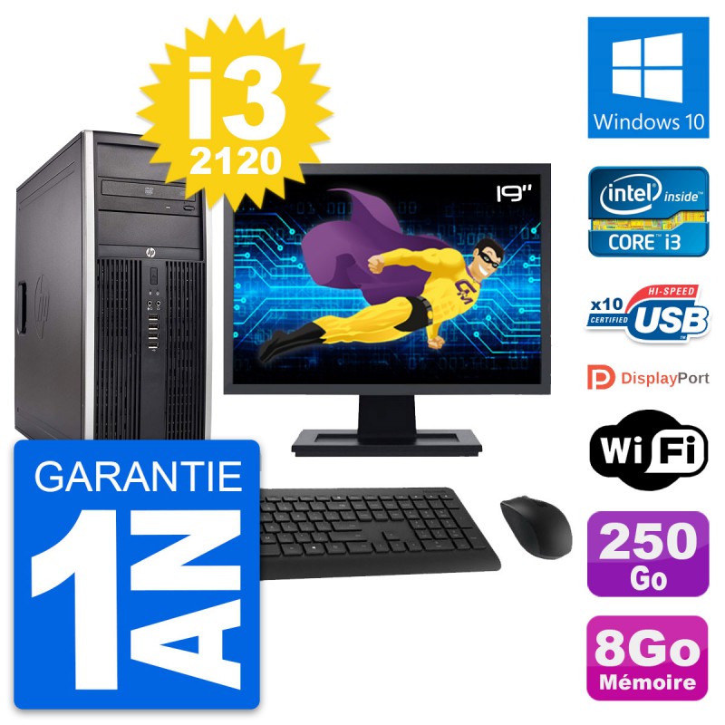 PC Tour HP 8300 Elite - Intel Core i3-2120 3.3 Ghz (3 Mo) - 8 Go DDR3 - Disque Dur 3,5" 250 Go - Graveur DVD - Clef Wifi USB - Windows 10 - Livré avec Ecran 19" + clavier + souris (Marques et modèles variables) - Garantie 1 an.