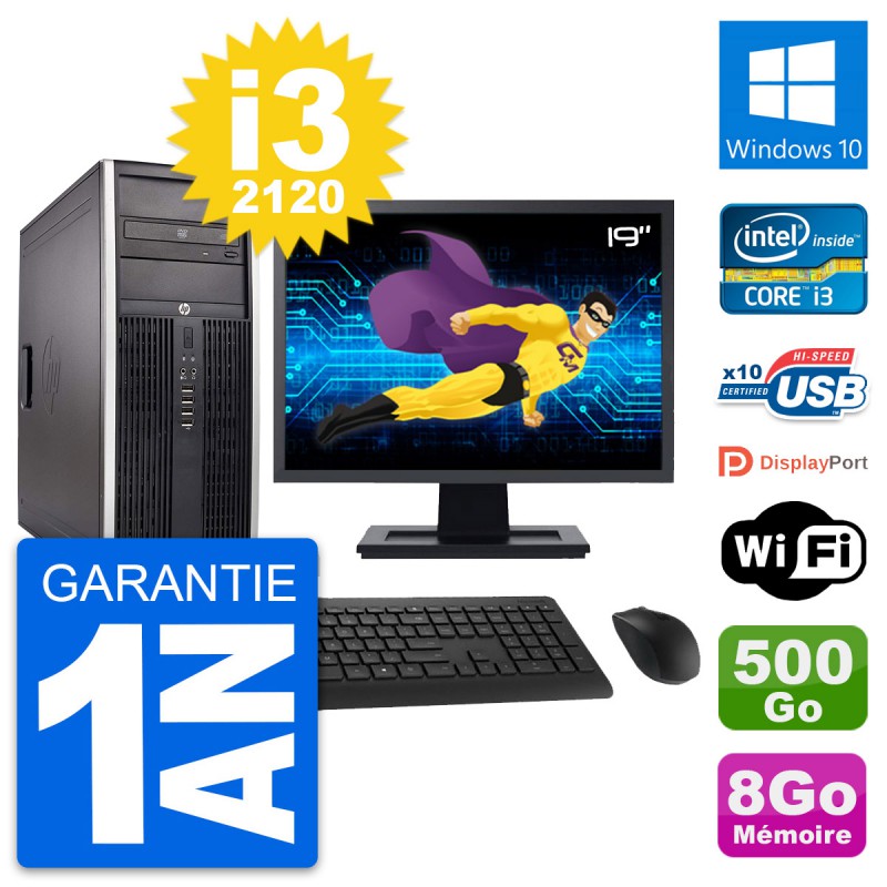 PC Tour HP 8300 Elite - Intel Core i3-2120 3.3 Ghz (3 Mo) - 8 Go DDR3 - Disque Dur 3,5" 500 Go - Graveur DVD - Clef Wifi USB - Windows 10 - Livré avec Ecran 19" + clavier + souris (Marques et modèles variables) - Garantie 1 an.