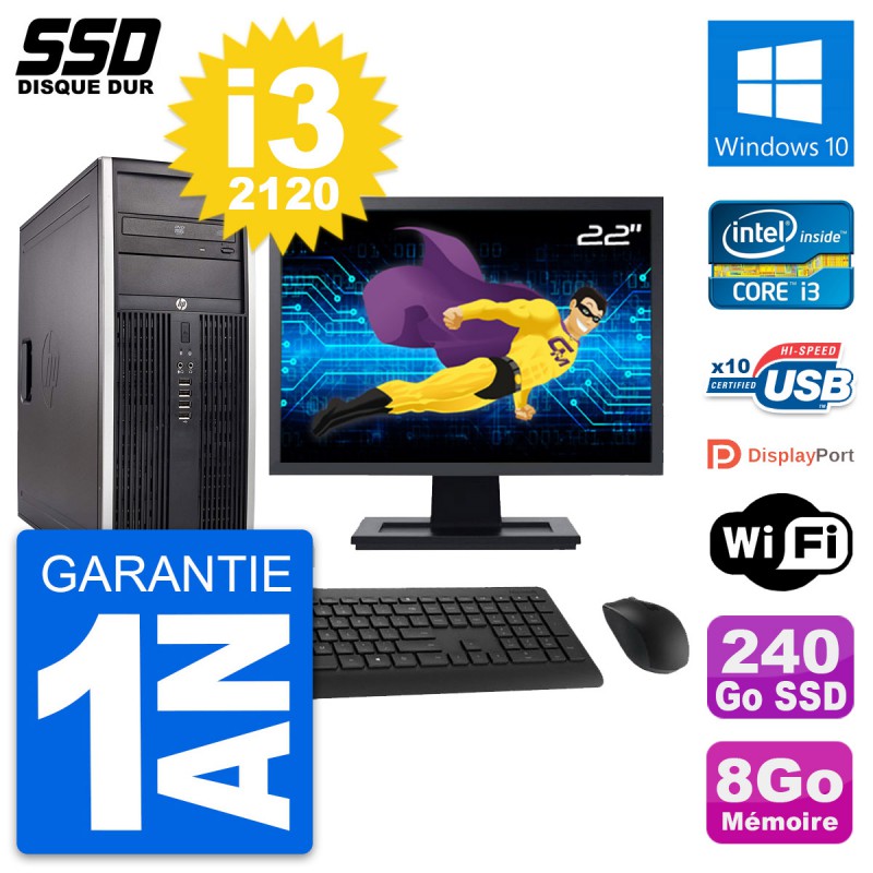 PC Tour HP Elite 8300 Ecran 22" Intel i3-2120 RAM 8Go SSD 240Go Windows 10 Wifi