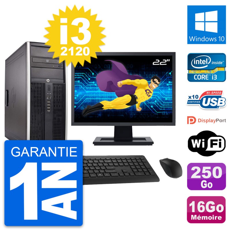 PC Tour HP 8300 Elite - Intel Core i3-2120 3.3 Ghz (3 Mo) - 16 Go DDR3 - Disque Dur 3,5" 250 Go - Graveur DVD - Clef Wifi USB - Windows 10 - Livré avec Ecran 22" + clavier + souris (Marques et modèles variables) - Garantie 1 an.