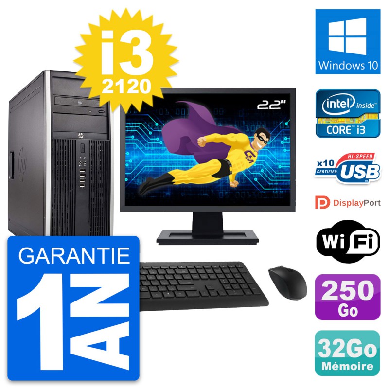 PC Tour HP 8300 Elite - Intel Core i3-2120 3.3 Ghz (3 Mo) - 32 Go DDR3 - Disque Dur 3,5" 250 Go - Graveur DVD - Clef Wifi USB - Windows 10 - Livré avec Ecran 22" + clavier + souris (Marques et modèles variables) - Garantie 1 an.