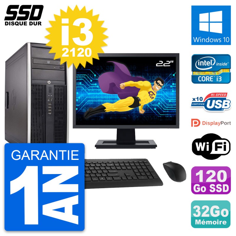 PC Tour HP Elite 8300 Ecran 22" Intel i3-2120 RAM 32Go SSD 120Go Windows 10 Wifi