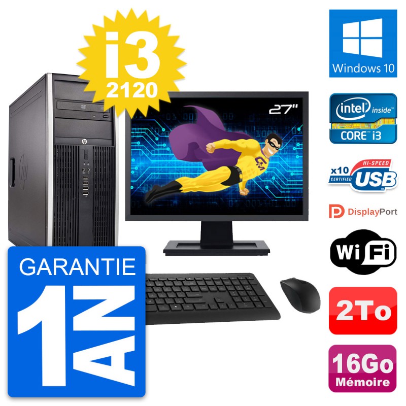PC Tour HP 8300 Elite - Intel Core i3-2120 3.3 Ghz (3 Mo) - 16 Go DDR3 - Disque Dur 3,5" 2 To - Graveur DVD - Clef Wifi USB - Windows 10 - Livré avec Ecran 27" + clavier + souris (Marques et modèles variables) - Garantie 1 an.