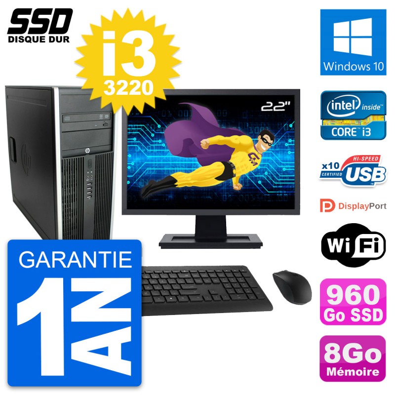 PC Tour HP Elite 8300 Ecran 22" Intel i3-3220 RAM 8Go SSD 960Go Windows 10 Wifi
