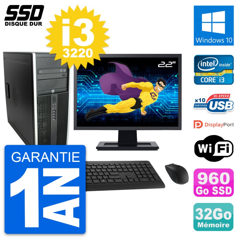 PC Tour HP Elite 8300 Ecran 22" Intel i3-3220 RAM 32Go SSD 960Go Windows 10 Wifi