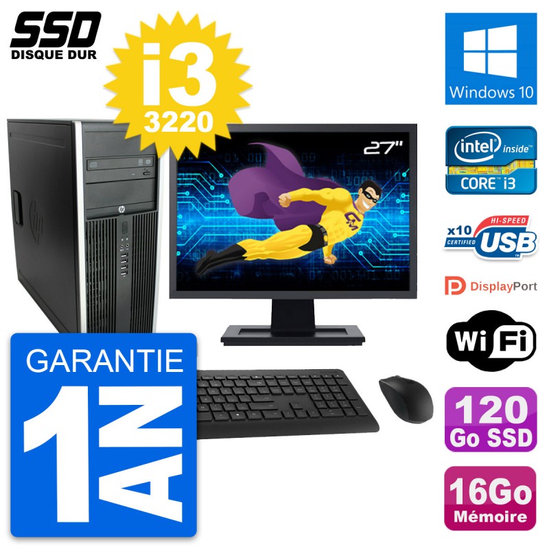 PC Tour HP Elite 8300 Ecran 27" Intel i3-3220 RAM 16Go SSD 120Go Windows 10 Wifi