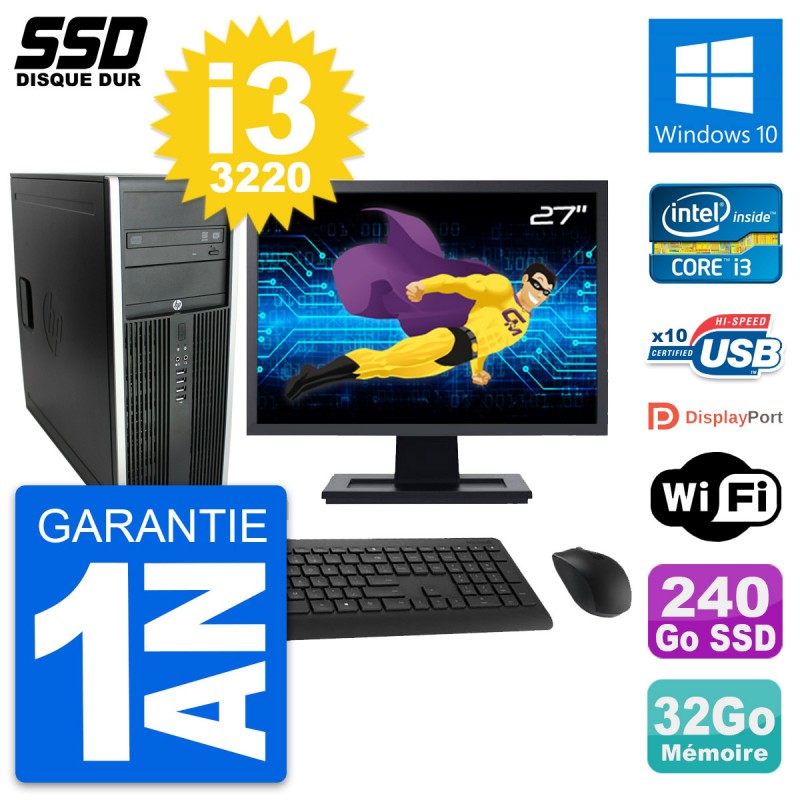 PC Tour HP 8300 Elite - Intel Core i3-3220 3.3 Ghz (3 Mo) - 32 Go DDR3 - Disque Dur SSD 240 Go - Graveur DVD - Clef Wifi USB - Windows 10 - Livré avec Ecran 27" + clavier + souris (Marques et modèles variables) - Garantie 1 an.