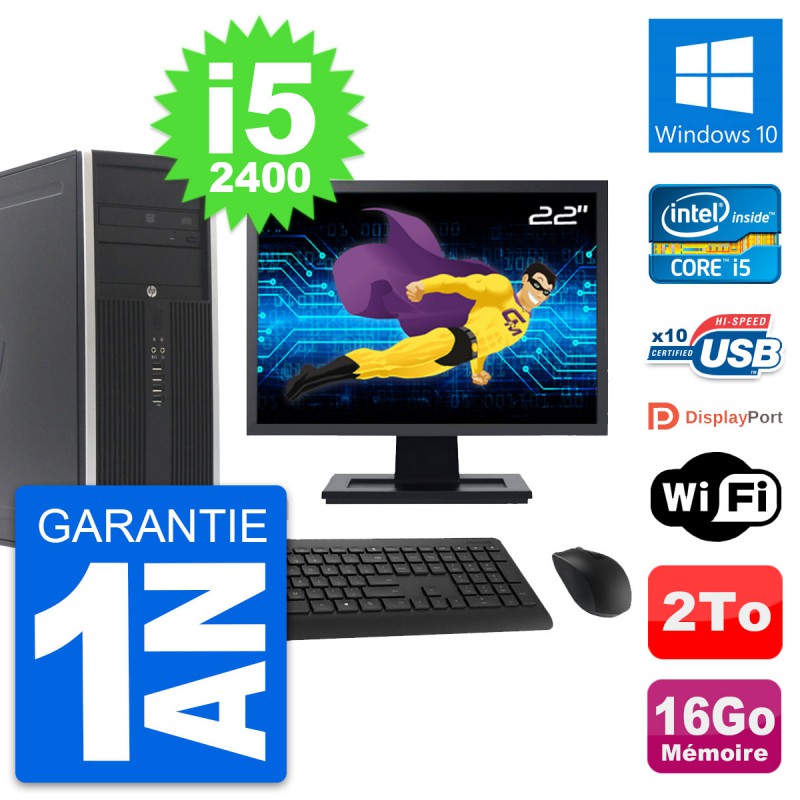PC Tour HP 8300 Elite - Intel Core i5-2400 3.1 Ghz (6 Mo) - 16 Go DDR3 - Disque Dur 3,5" 2 To - Graveur DVD - Clef Wifi USB - Windows 10 - Livré avec Ecran 22" + clavier + souris (Marques et modèles variables) - Garantie 1 an.