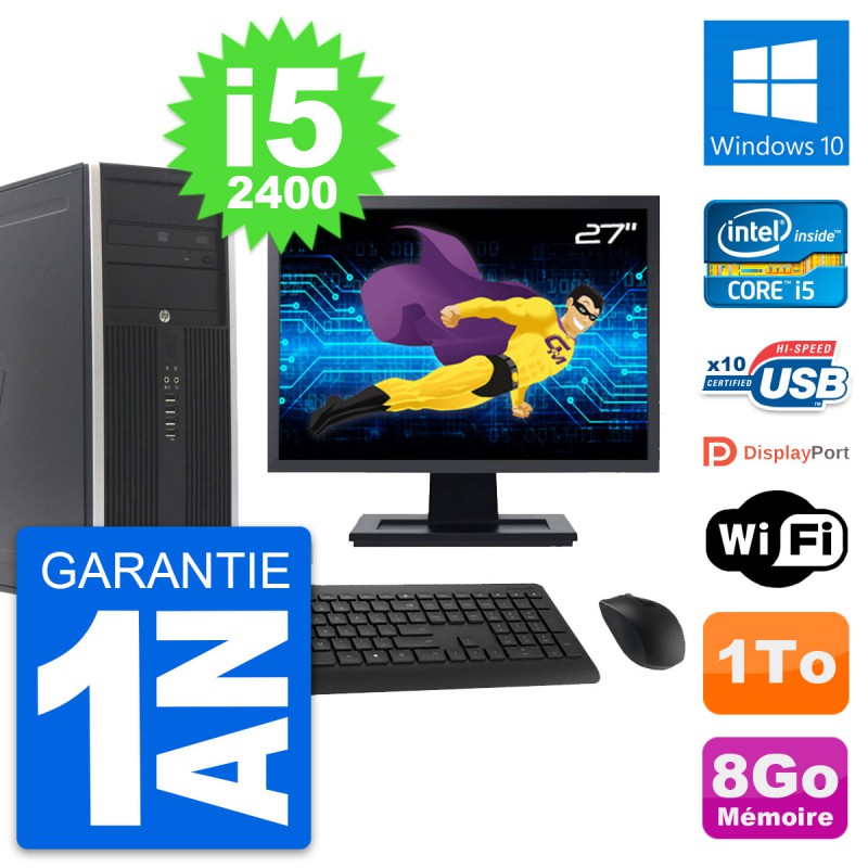 PC Tour HP 8300 Elite - Intel Core i5-2400 3.1 Ghz (6 Mo) - 8 Go DDR3 - Disque Dur 3,5" 1 To - Graveur DVD - Clef Wifi USB - Windows 10 - Livré avec Ecran 27" + clavier + souris (Marques et modèles variables) - Garantie 1 an.
