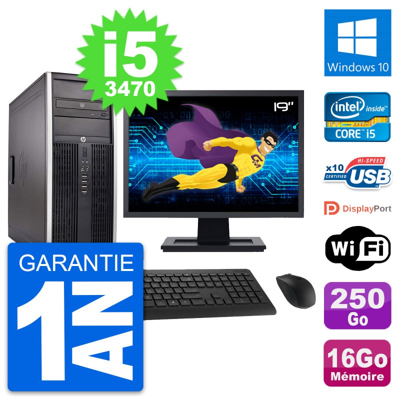 PC Tour HP 8300 Elite - Intel Core i5-3470 3.2 Ghz (6 Mo) - 16 Go DDR3 - Disque Dur 3,5" 250 Go - Graveur DVD - Clef Wifi USB - Windows 10 - Livré avec Ecran 19" + clavier + souris (Marques et modèles variables) - Garantie 1 an.