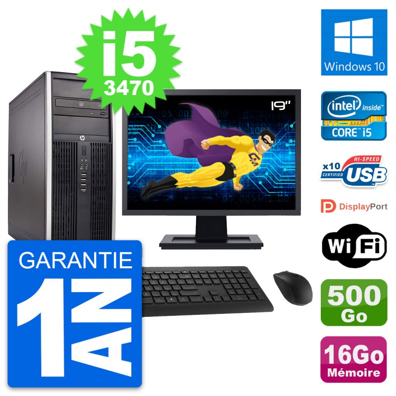 PC Tour HP 8300 Elite - Intel Core i5-3470 3.2 Ghz (6 Mo) - 16 Go DDR3 - Disque Dur 3,5" 500 Go - Graveur DVD - Clef Wifi USB - Windows 10 - Livré avec Ecran 19" + clavier + souris (Marques et modèles variables) - Garantie 1 an.
