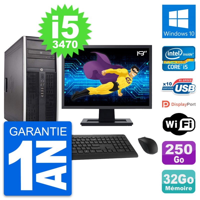 PC Tour HP 8300 Elite - Intel Core i5-3470 3.2 Ghz (6 Mo) - 32 Go DDR3 - Disque Dur 3,5" 250 Go - Graveur DVD - Clef Wifi USB - Windows 10 - Livré avec Ecran 19" + clavier + souris (Marques et modèles variables) - Garantie 1 an.