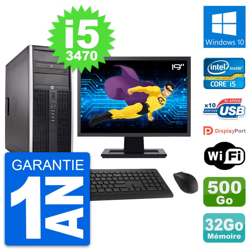 PC Tour HP 8300 Elite - Intel Core i5-3470 3.2 Ghz (6 Mo) - 32 Go DDR3 - Disque Dur 3,5" 500 Go - Graveur DVD - Clef Wifi USB - Windows 10 - Livré avec Ecran 19" + clavier + souris (Marques et modèles variables) - Garantie 1 an.