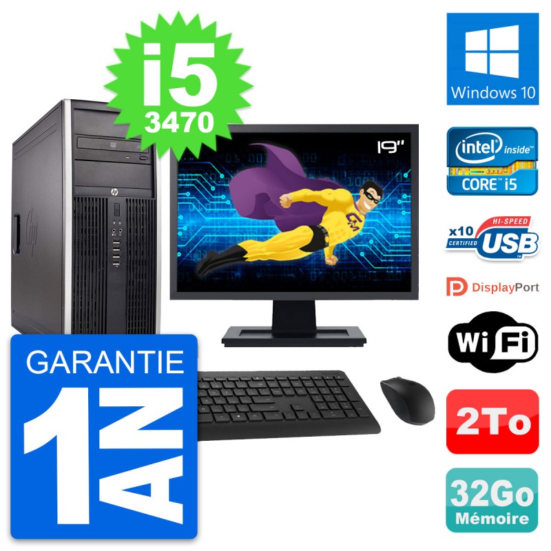PC Tour HP 8300 Elite - Intel Core i5-3470 3.2 Ghz (6 Mo) - 32 Go DDR3 - Disque Dur 3,5" 2 To - Graveur DVD - Clef Wifi USB - Windows 10 - Livré avec Ecran 19" + clavier + souris (Marques et modèles variables) - Garantie 1 an.