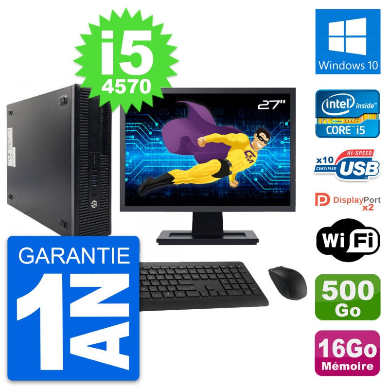 PC HP ProDesk 600 G1 SFF (Slim) - Intel Core i5-4570 3.2 Ghz (6 Mo) - 16 Go DDR3 - Disque Dur 3,5" 500 Go - Graveur DVD - Clef Wifi USB - Windows 10 - Livré avec Ecran 27" + clavier + souris (Marques et modèles variables) - Garantie 1 an.