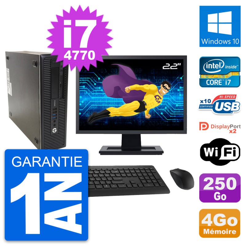 PC HP 600 G1 SFF Ecran 22" Intel i7-4770 RAM 4Go Disque 250Go Windows 10 Wifi