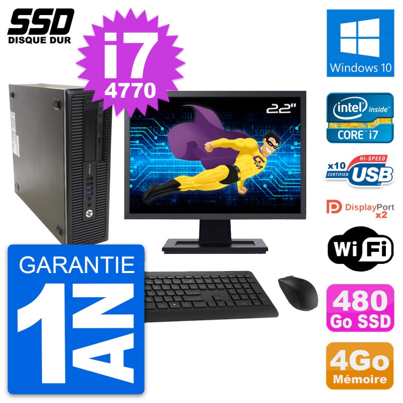 PC HP ProDesk 600 G1 SFF (Slim) - Intel Core i7-4770 3.4 Ghz (8 Mo) - 4 Go DDR3 - Disque Dur SSD 480 Go - Graveur DVD - Clef Wifi USB - Windows 10 - Livré avec Ecran 22" + clavier + souris (Marques et modèles variables) - Garantie 1 an.