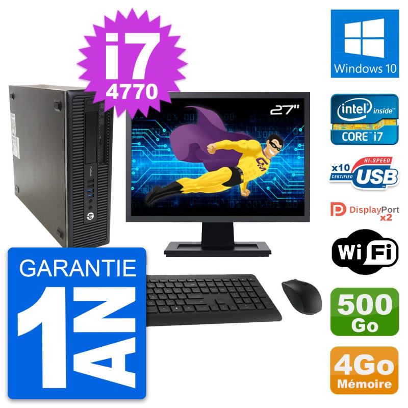 PC HP ProDesk 600 G1 SFF (Slim) - Intel Core i7-4770 3.4 Ghz (8 Mo) - 4 Go DDR3 - Disque Dur 3,5" 500 Go - Graveur DVD - Clef Wifi USB - Windows 10 - Livré avec Ecran 27" + clavier + souris (Marques et modèles variables) - Garantie 1 an.