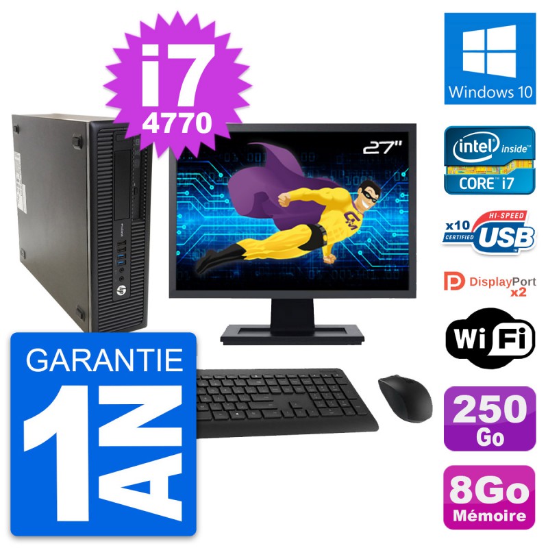 PC HP ProDesk 600 G1 SFF (Slim) - Intel Core i7-4770 3.4 Ghz (8 Mo) - 8 Go DDR3 - Disque Dur 3,5" 250 Go - Graveur DVD - Clef Wifi USB - Windows 10 - Livré avec Ecran 27" + clavier + souris (Marques et modèles variables) - Garantie 1 an.