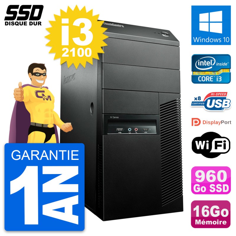 PC Tour Lenovo ThinkCentre M91p - Intel Core i3-2120 3.1 Ghz (3 Mo) - 16 Go DDR3 - Disque Dur SSD 960 Go - Clef Wifi USB - Windows 10 - Garantie 1 an.