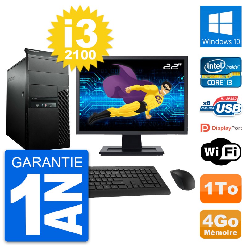 PC Tour Lenovo M91p Ecran 22" Intel i3-2100 RAM 4Go Disque 1To Windows 10 Wifi