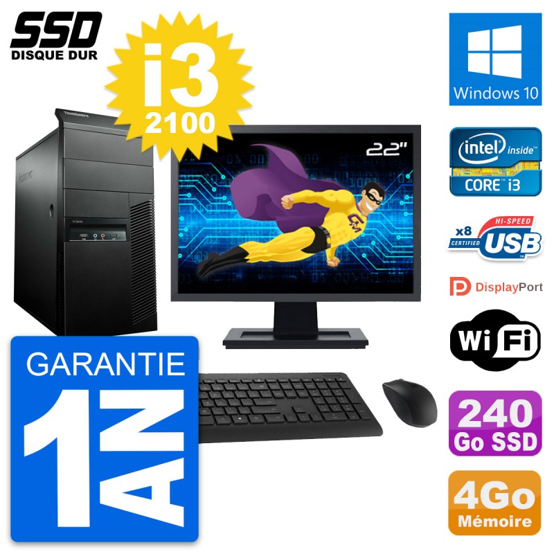 PC Tour Lenovo ThinkCentre M91p - Intel Core i3-2120 3.1 Ghz (3 Mo) - 4 Go DDR3 - Disque Dur SSD 240 Go - Clef Wifi USB - Windows 10 - Livré avec Ecran 22" + clavier + souris (Marques et modèles variables) - Garantie 1 an.