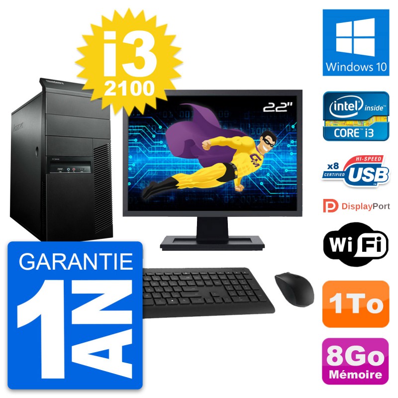 PC Tour Lenovo M91p Ecran 22" Core i3-2100 RAM 8Go Disque 1To Windows 10 Wifi