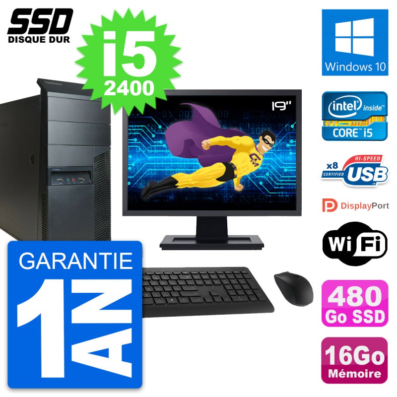 PC Tour Lenovo ThinkCentre M91p - Intel Core i5-2400 3.1 Ghz (6 Mo) - 16 Go DDR3 - Disque Dur SSD 480 Go - Clef Wifi USB - Windows 10 - Livré avec Ecran 19" + clavier + souris (Marques et modèles variables) - Garantie 1 an.