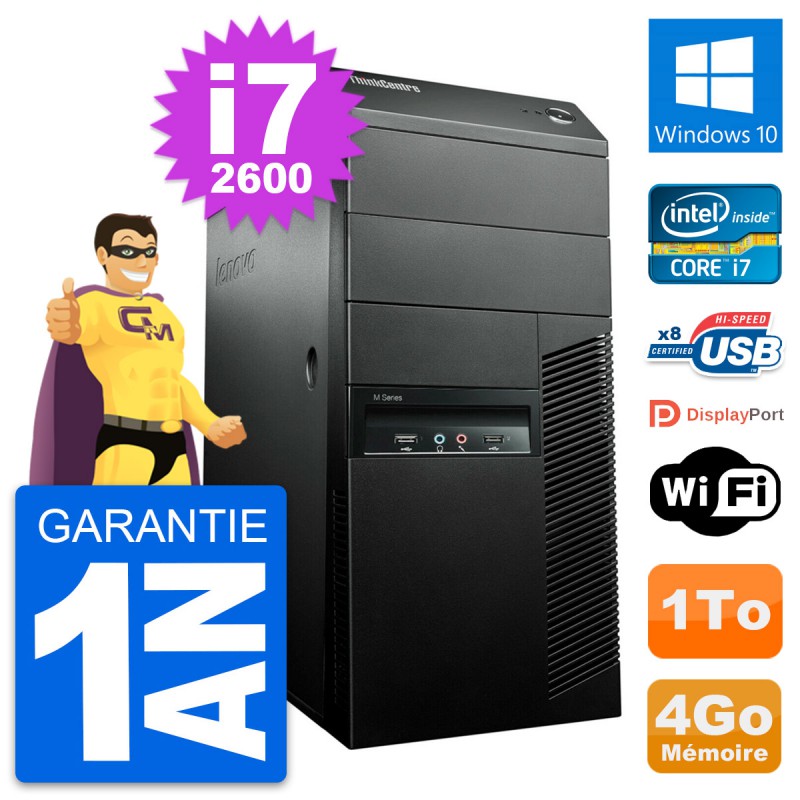 PC Tour Lenovo ThinkCentre M91p - Intel Core i7-2600 3.4 Ghz (8 Mo) - 4 Go DDR3 - Disque Dur 3,5" 1 To - Clef Wifi USB - Windows 10 - Garantie 1 an.