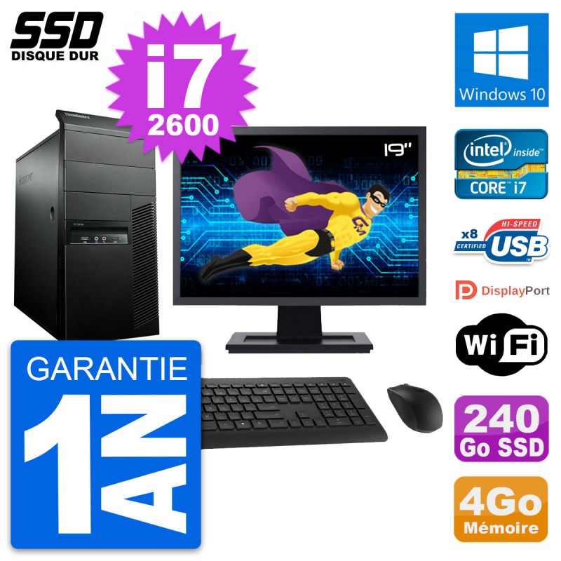 PC Tour Lenovo M91p Ecran 19" Core i7-2600 RAM 4Go SSD 240Go Windows 10 Wifi