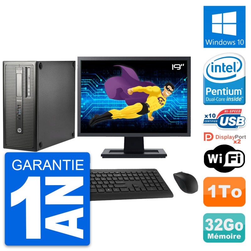 PC Tour HP EliteDesk 800 G1 Ecran 19" G3220 RAM 32Go Disque 1To Windows 10 Wifi