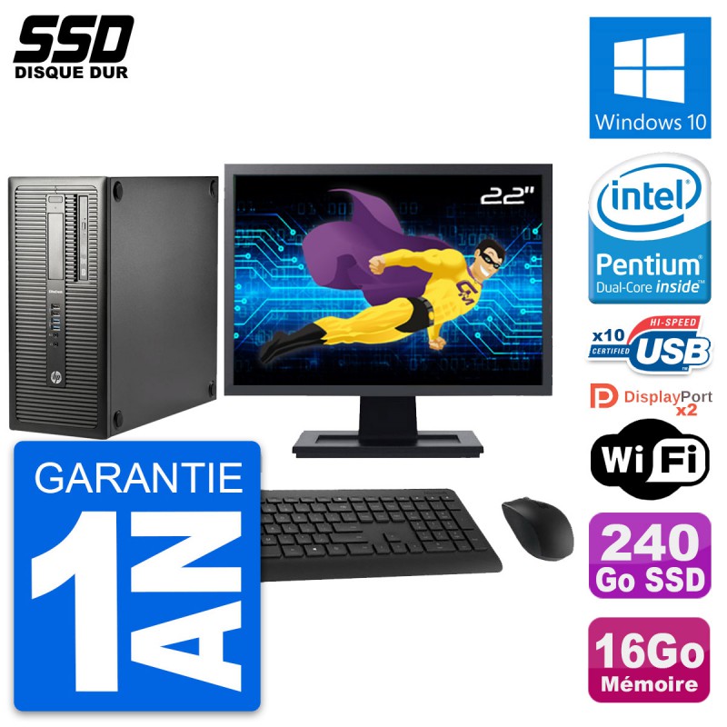 PC Tour HP EliteDesk 800 G1 - Intel Pentium G3220 3.0 Ghz (3 Mo) - 16 Go DDR3 - Disque Dur SSD 240 Go - Graveur DVD - Clef Wifi USB - Windows 10 - Livré avec Ecran 22" + clavier + souris (Marques et modèles variables) - Garantie 1 an.