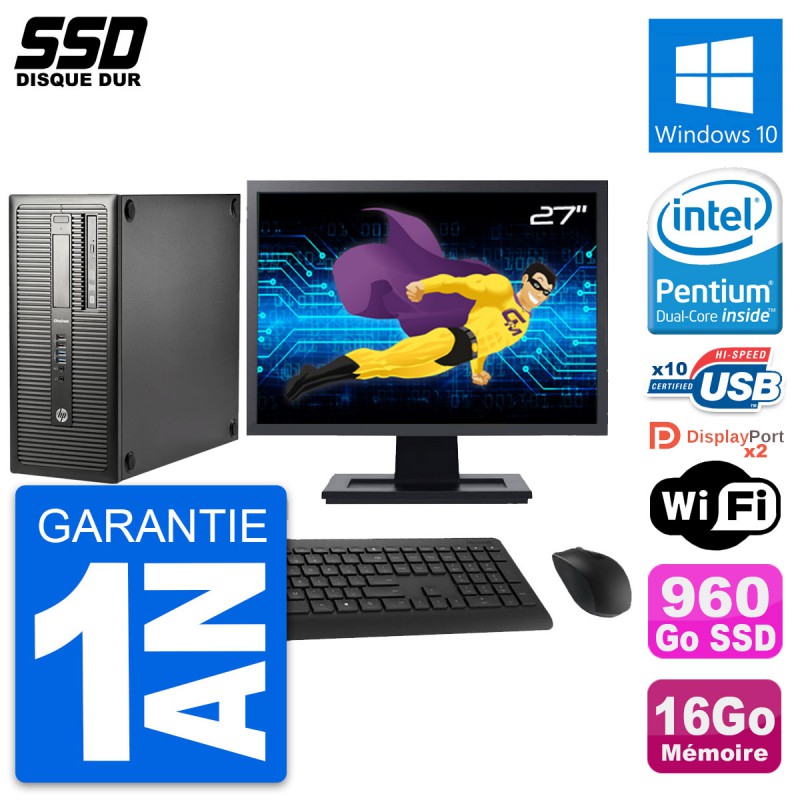PC Tour HP EliteDesk 800 G1 - Intel Pentium G3220 3.0 Ghz (3 Mo) - 16 Go DDR3 - Disque Dur SSD 960 Go - Graveur DVD - Clef Wifi USB - Windows 10 - Livré avec Ecran 27" + clavier + souris (Marques et modèles variables) - Garantie 1 an.