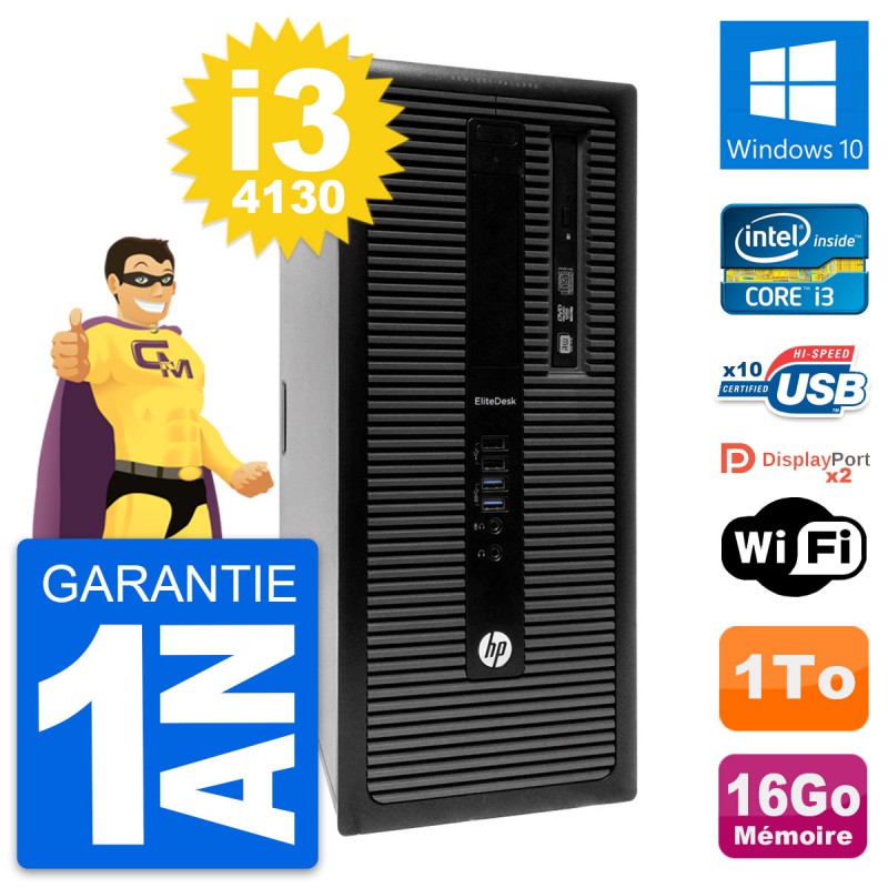 PC Tour HP EliteDesk 800 G1 - Intel Core i3-4130 3.4 Ghz (3 Mo) - 16 Go DDR3 - Disque Dur 3,5" 1 To - Graveur DVD - Clef Wifi USB - Windows 10 - Garantie 1 an.