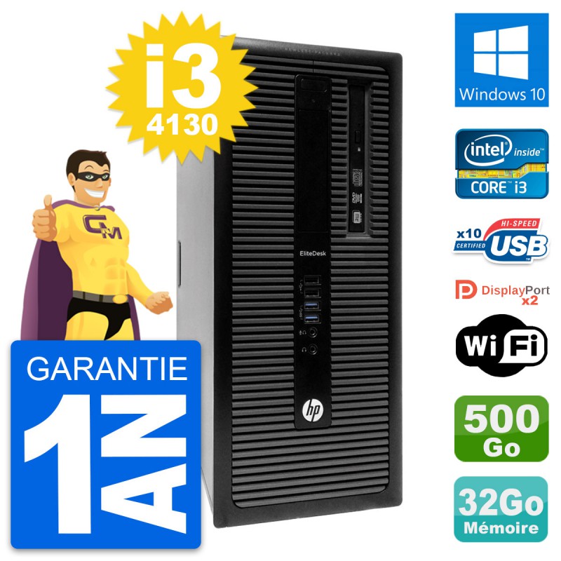PC Tour HP EliteDesk 800 G1 - Intel Core i3-4130 3.4 Ghz (3 Mo) - 32 Go DDR3 - Disque Dur 3,5" 500 Go - Graveur DVD - Clef Wifi USB - Windows 10 - Garantie 1 an.