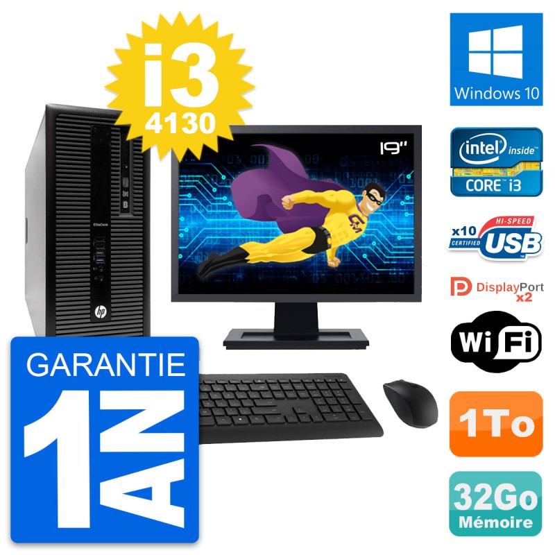PC Tour HP 800 G1 Ecran 19" Intel i3-4130 RAM 32Go Disque 1To Windows 10 Wifi