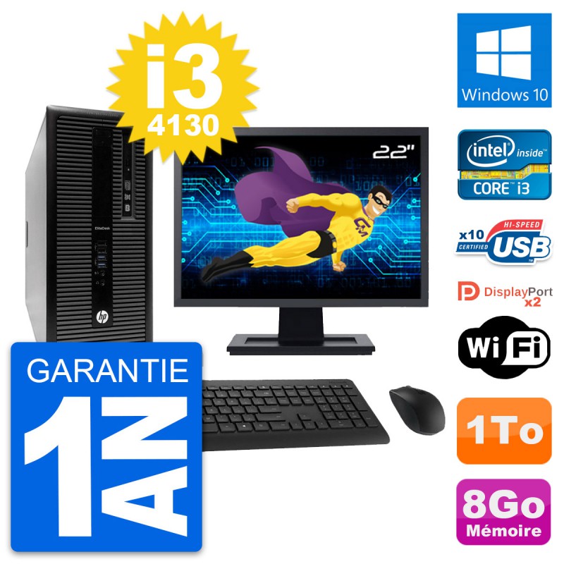 PC Tour HP EliteDesk 800 G1 - Intel Core i3-4130 3.4 Ghz (3 Mo) - 8 Go DDR3 - Disque Dur 3,5" 1 To - Graveur DVD - Clef Wifi USB - Windows 10 - Livré avec Ecran 22" + clavier + souris (Marques et modèles variables) - Garantie 1 an.
