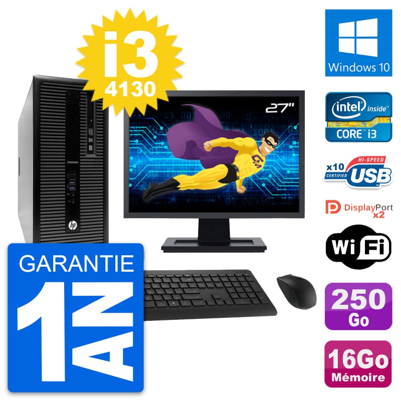 PC Tour HP EliteDesk 800 G1 - Intel Core i3-4130 3.4 Ghz (3 Mo) - 16 Go DDR3 - Disque Dur 3,5" 250 Go - Graveur DVD - Clef Wifi USB - Windows 10 - Livré avec Ecran 27" + clavier + souris (Marques et modèles variables) - Garantie 1 an.