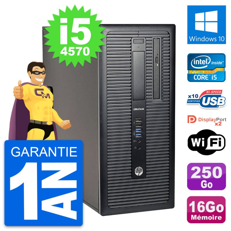 PC Tour HP EliteDesk 800 G1 - Intel Core i5-4570 3.2 Ghz (6 Mo) - 16 Go DDR3 - Disque Dur 3,5" 250 Go - Graveur DVD - Clef Wifi USB - Windows 10 - Garantie 1 an.