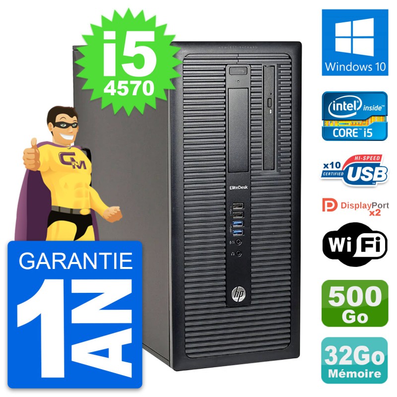 PC Tour HP EliteDesk 800 G1 - Intel Core i5-4570 3.2 Ghz (6 Mo) - 32 Go DDR3 - Disque Dur 3,5" 500 Go - Graveur DVD - Clef Wifi USB - Windows 10 - Garantie 1 an.