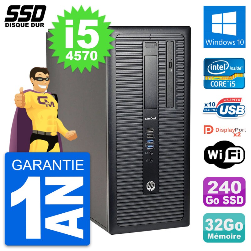 PC Tour HP EliteDesk 800 G1 - Intel Core i5-4570 3.2 Ghz (6 Mo) - 32 Go DDR3 - Disque Dur SSD 240 Go - Graveur DVD - Clef Wifi USB - Windows 10 - Garantie 1 an.
