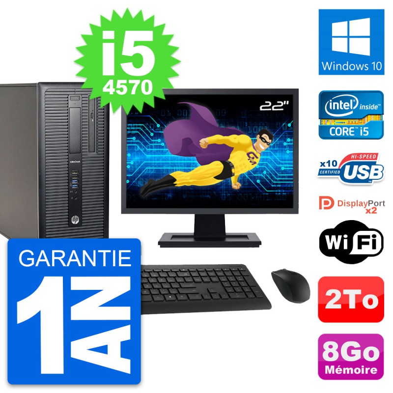 PC Tour HP EliteDesk 800 G1 - Intel Core i5-4570 3.2 Ghz (6 Mo) - 8 Go DDR3 - Disque Dur 3,5" 2 To - Graveur DVD - Clef Wifi USB - Windows 10 - Livré avec Ecran 22" + clavier + souris (Marques et modèles variables) - Garantie 1 an.